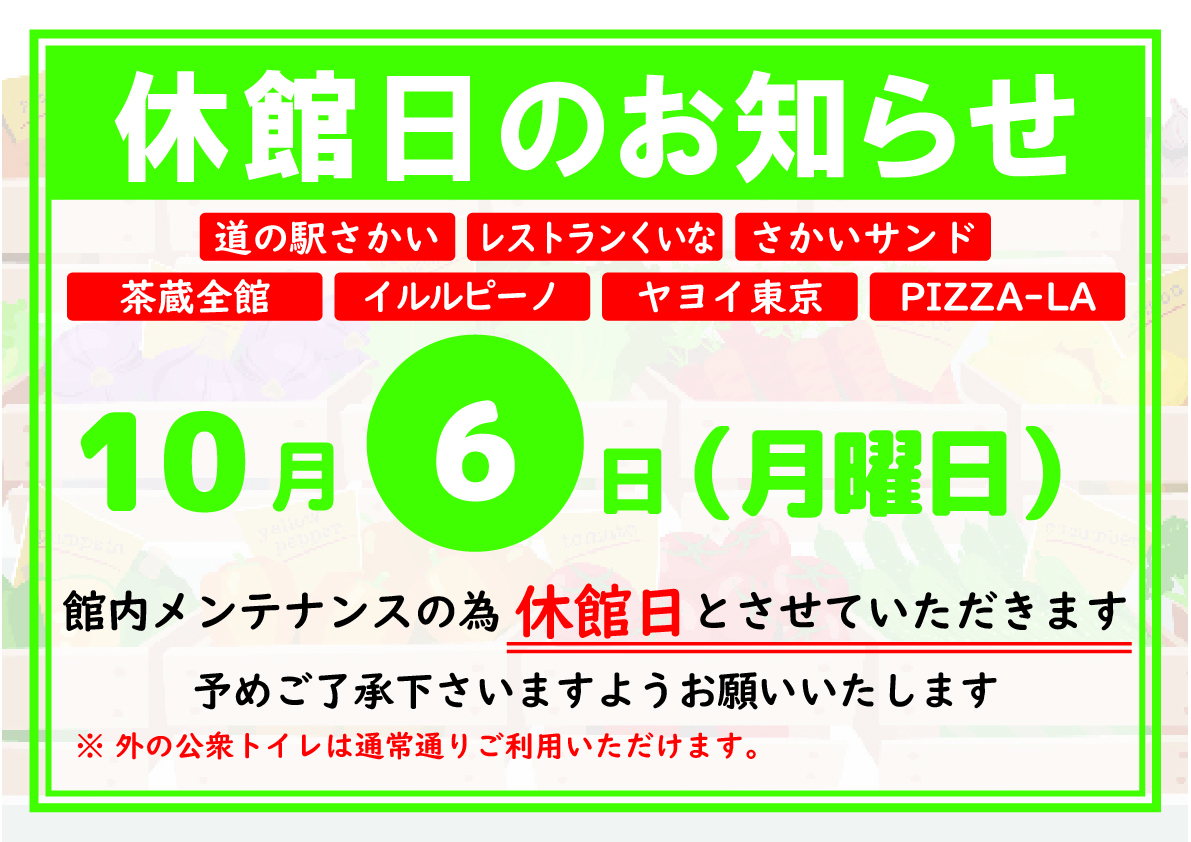 10月6日(月)は、道の駅さかい、及び飲食店各店舗が館内メンテナンスのため、休館とさせて頂きます。