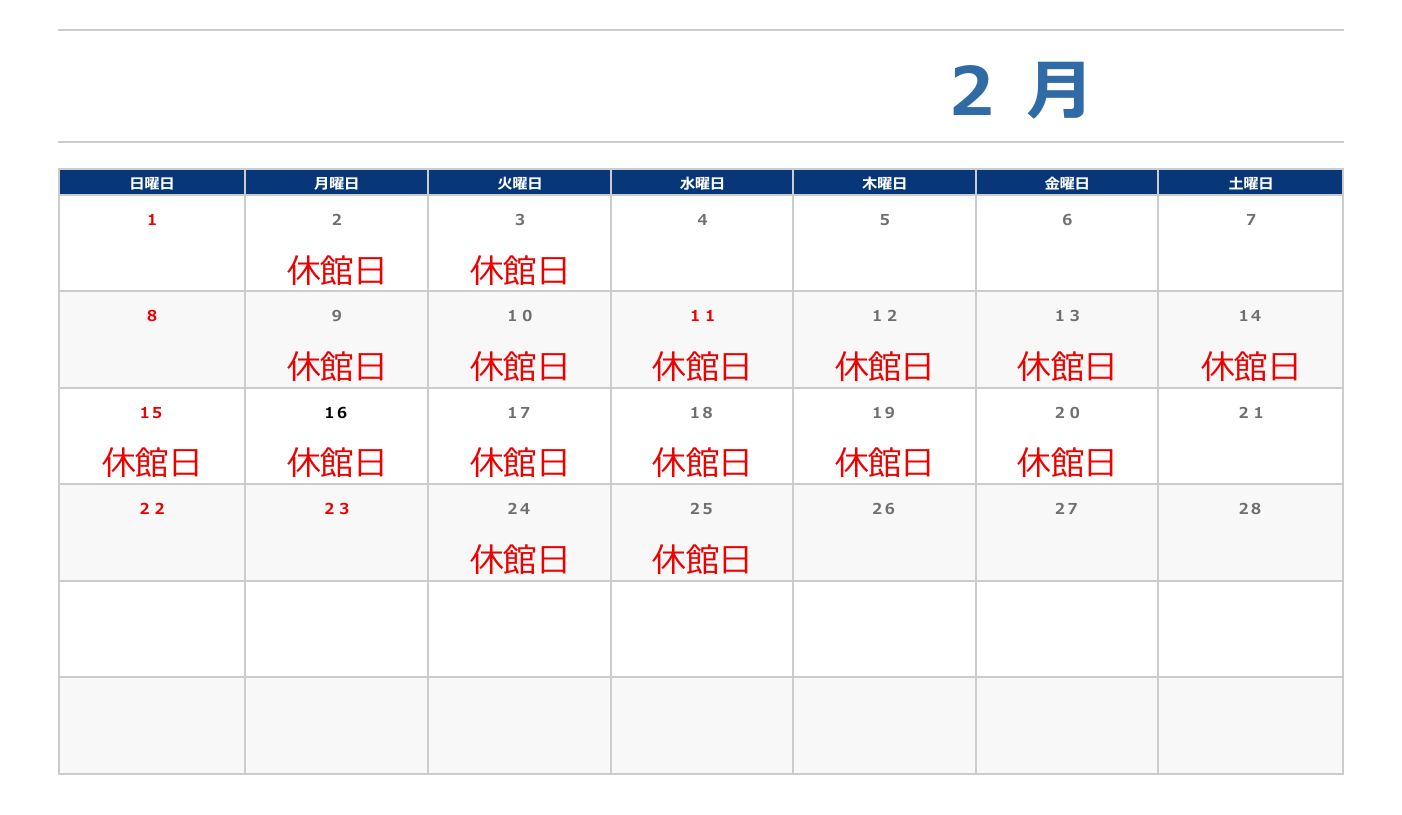 2月の休館日を記したカレンダーをアップさせていただきます。