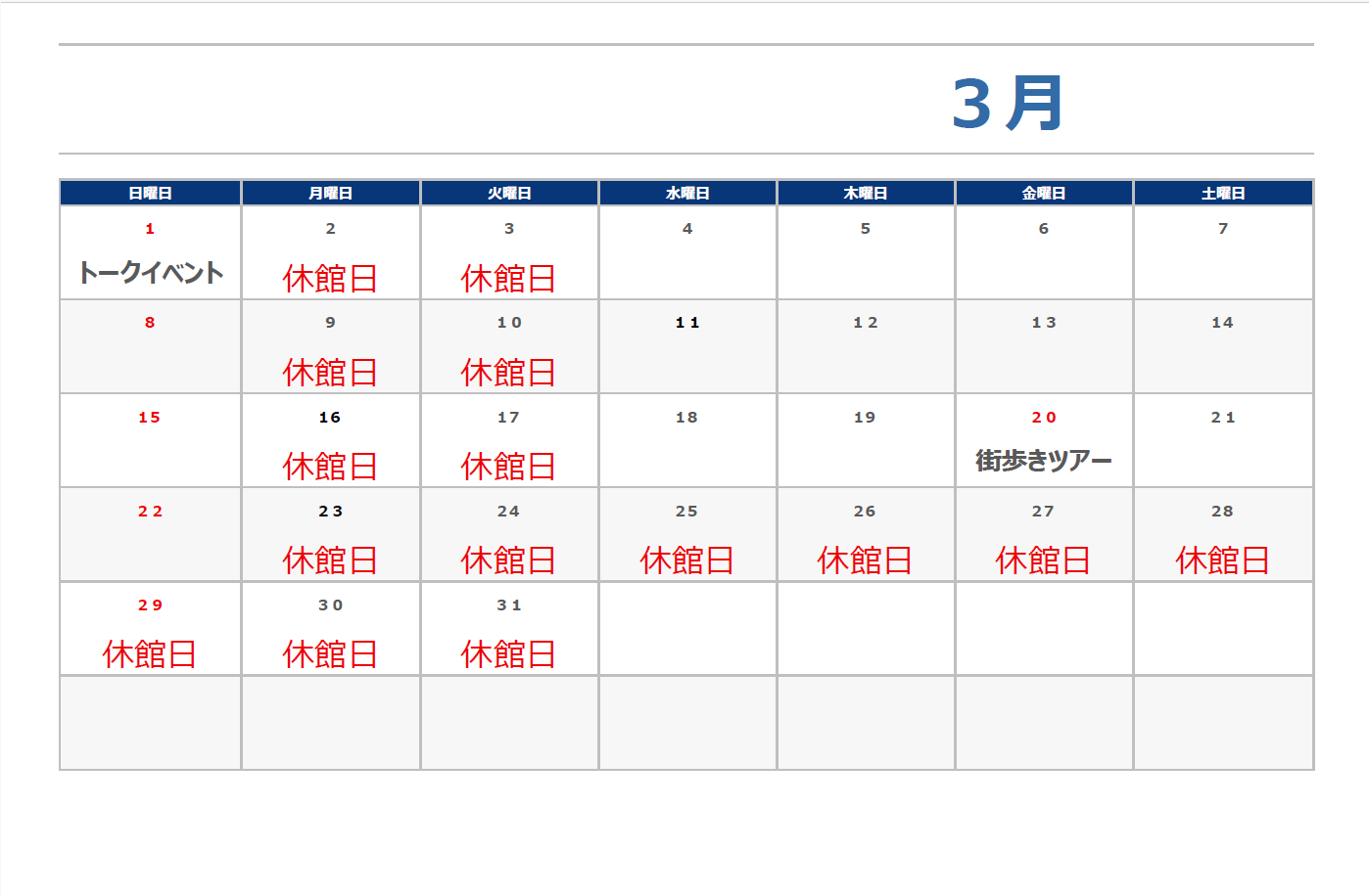 いつもS-Gallery 粛粲寶美術館をご利用いただきましてありがとうございます。 3月の休館日を記したカレンダーをアップさせていただきます。 お客様にはご不便とご迷惑をお掛けいたしますが、ご了承の程、よろしくお願いいたします。